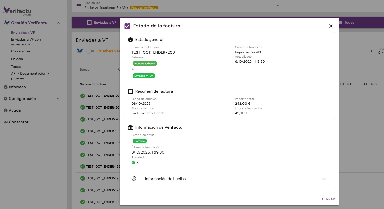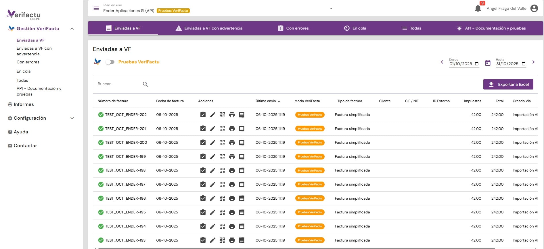 Allí podrás revisar el resultado de cada envío a la AEAT, visualizar el QR, imprimir los formatos estándar y consultar la trazabilidad entre facturas.