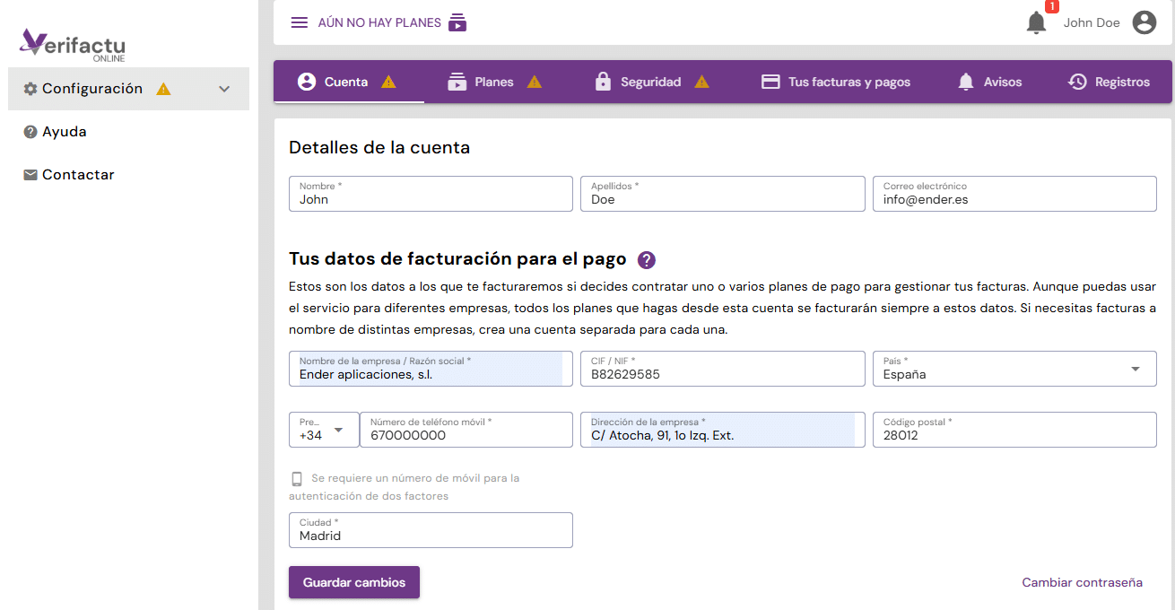 - Da de alta un plan de tipo API o ERP con los datos de tu empresa.